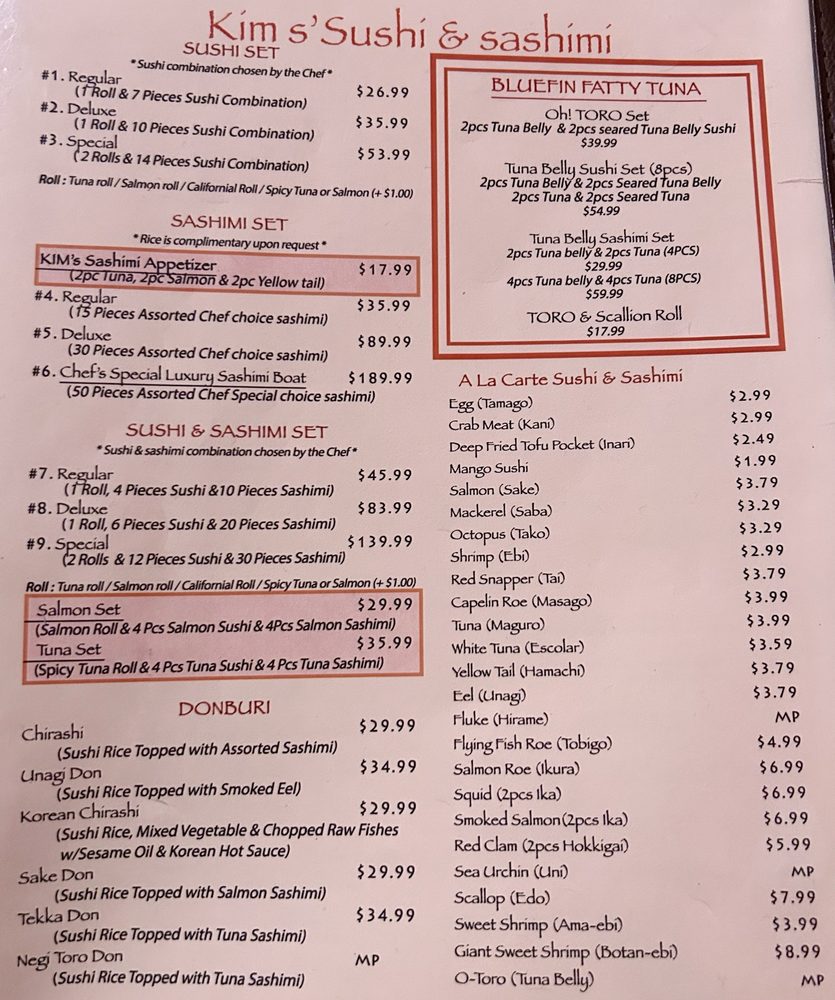 One standout feature is the Ginger Salad, which pairs perfectly with their fresh sashimi sets, including the delectable 2-piece tuna and salmon. For heartier dishes, the Chirashi and Unagi Don stand out, each beautifully combining sushi rice with exquisite toppings. Reviews highlight the restaurant’s exceptional service and authentic flavors, making every visit a delightful experience. Kim's is not just about food; it’s a warm atmosphere where you'll want to return time and again.